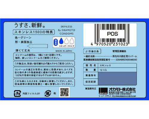 スキン(皮膜)+レス(〜のない)の名の通り、スキンがあることを感じさせない薄さでパートナーの温もりや感触もリアルに感じられ、プレイが燃え上がること間違いなし!表裏のわかりやすい加工も嬉しい、爽やかなグリーンのコンドームです。 | |